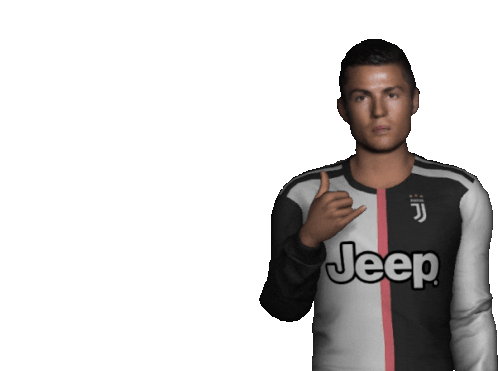 Cristiano Ronaldo, also known as CR7, makes a "call me" gesture while wearing his Juventus jersey.