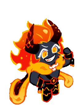 A vibrant, animated fiery demon character from Cookie Run Kingdom, with horns, a skull emblem, and a mischievous grin.