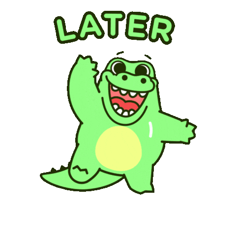 A cheerful green cartoon crocodile waves happily, with the word 'LATER' displayed above, perfect for playful goodbyes.