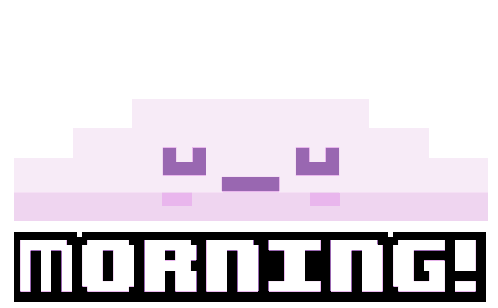 A pixelated, light purple cloud from Crossy Road winks and smiles, wishing 'MORNING!' in a cheerful greeting.