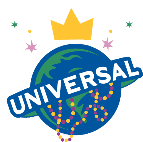 Animated Universal logo featuring a globe, crown, and Mardi Gras beads, celebrating the festive event.