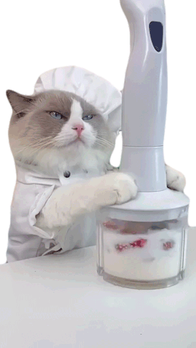 A serious cat chef, also known as Meow Chef, intently blends food with an immersion blender.