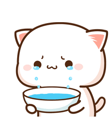 A cute anime-style cat character is crying, with tears filling a bowl it holds, expressing sadness.
