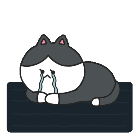A cute cartoon cat with black and white fur is lying down and crying, expressing sadness and a bad mood.