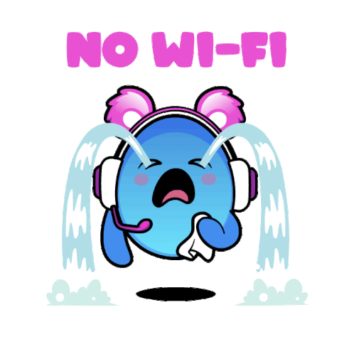 A cute blue character with headphones cries profusely, holding a tissue, as the text 'NO WI-FI' appears above, expressing sadness.