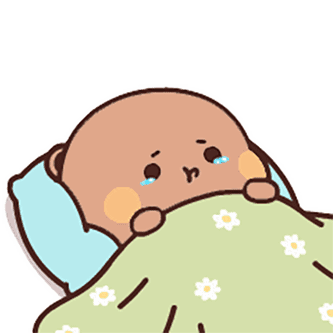 A cute cartoon bear lies in bed with a pillow and blanket, shedding tears. Expresses sadness or emotional distress.