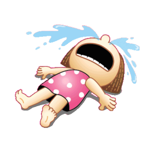 A cute cartoon girl in a pink polka dot dress transitions from sad to crying loudly with splashing tears.