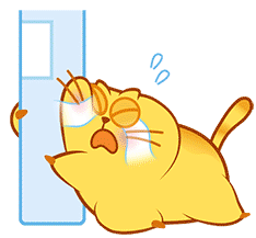 A cute, chubby orange cat is crying profusely with large tears and sweat drops, looking very sad and distressed.