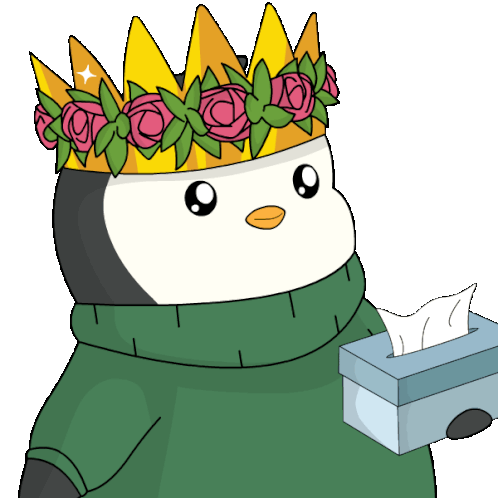 A cute Pudgy Penguin, wearing a crown and green sweater, holds a box of tissues, ready to comfort or express sadness.