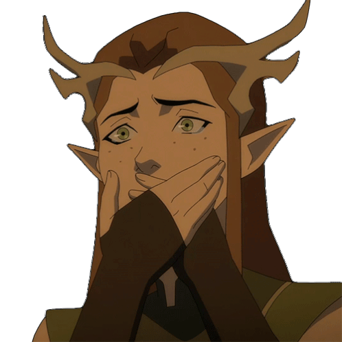 Keyleth from The Legend of Vox Machina is shown in emotional distress, covering her mouth and shedding tears, then revealing a sad expression.