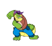 A cartoon alligator, Crype150 Cowcat, wearing a cowboy hat and jeans, performs a powerful spinning tail attack.