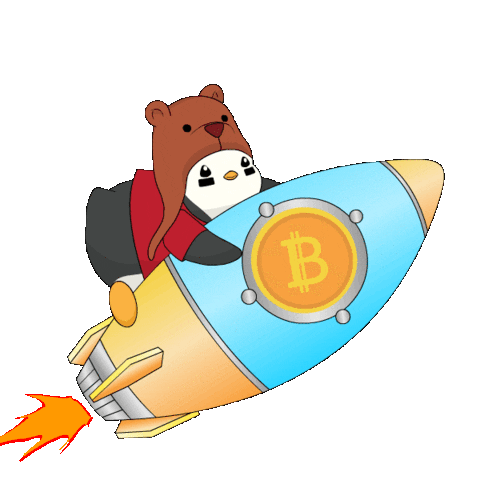 A Pudgy Penguin and a bear in a hat ride a rocket with a Bitcoin symbol, symbolizing 'to the moon' crypto sentiment and HODL.