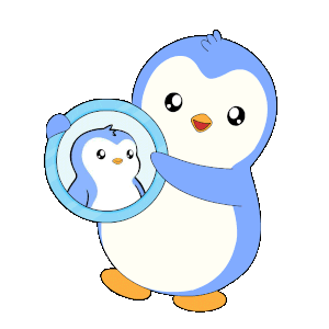 a blue penguin is holding a magnifying glass and looking at its reflection