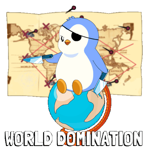 a penguin holding a knife on top of a globe with the words world domination below