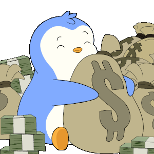 A joyful Pudgy Penguin embraces a large bag of crypto money, surrounded by stacks of cash, symbolizing immense wealth.