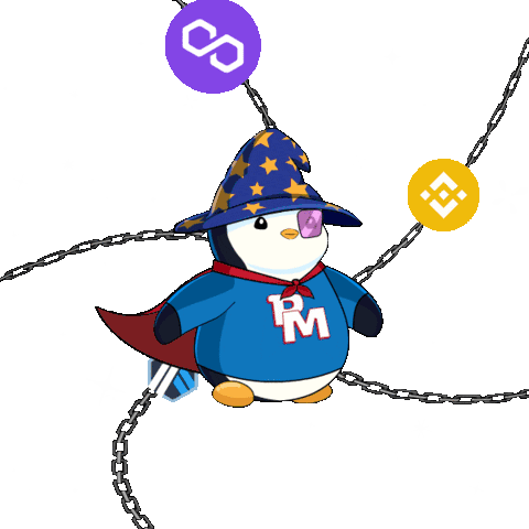 An animated Pudgy Penguin wizard, wearing a blue cape and hat, connected by chains to various crypto logos.