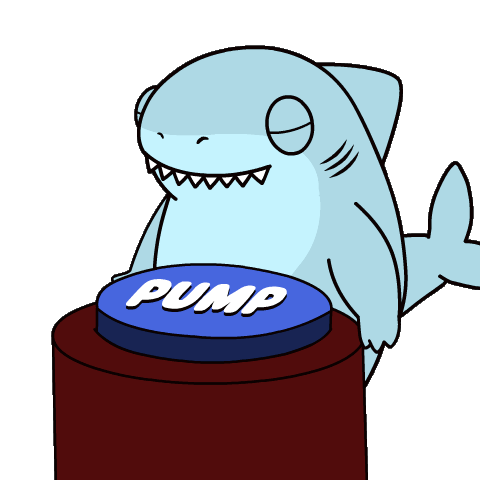 An Ordinary Frends cartoon shark excitedly pushes a blue 'PUMP' button, signaling crypto market growth.