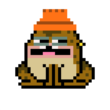 A pixel art Cryptoadz character, resembling Pete Davidson, blinks with a tired expression, wearing an orange beanie and sunglasses.
