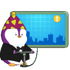 A festive purple Pudgy Penguin in a suit pumps up a cryptocurrency price chart showing significant growth, with a golden coin at the peak.