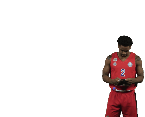 A CSKA basketball player in a red jersey, number 2, looks intently at his mobile phone, possibly reacting to a message.