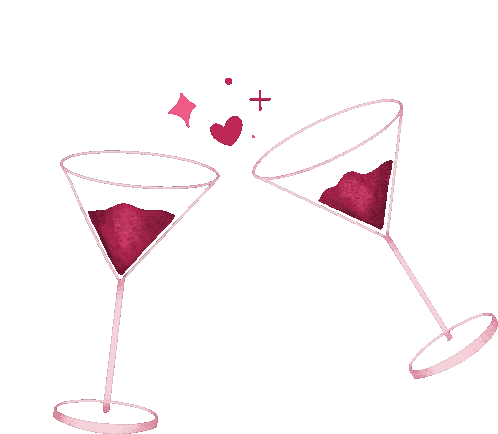 Two martini glasses clink together, red wine splashing, with small hearts and sparkles, perfect for a romantic toast.