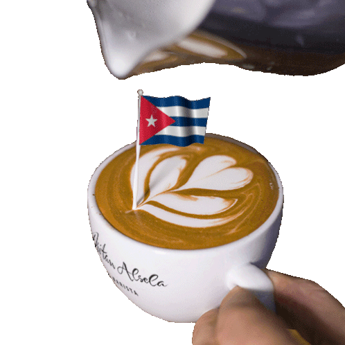 A delicious cup of coffee with intricate latte art, featuring the flag of Cuba proudly displayed. Perfect for coffee lovers and Cuban pride.