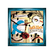 a blue frame with a picture of a dinosaur and the word lemon demon on it
