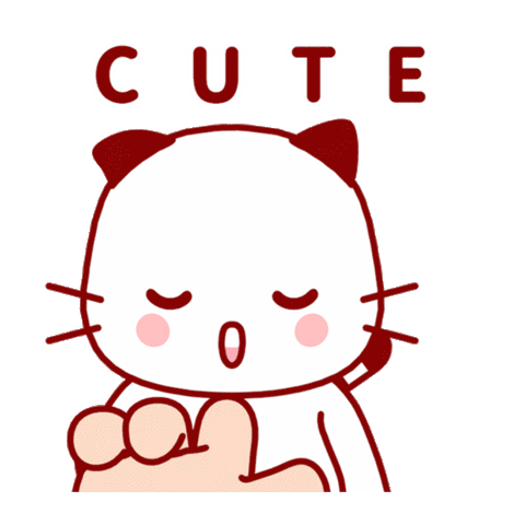 A cute white cat character transitions from a shushing gesture to a happy smile with a sparkling heart, featuring the word 'CUTE'.