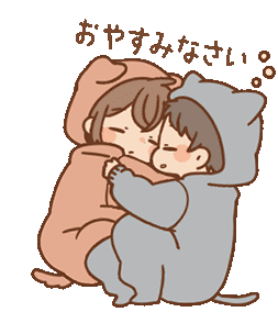 Two adorable cartoon characters in animal onesies share a sweet good night cuddle, drifting off to sleep peacefully.