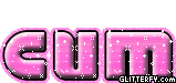 An animated sticker featuring the word 'Cum' in pink and black, with a glittery effect on a white background.