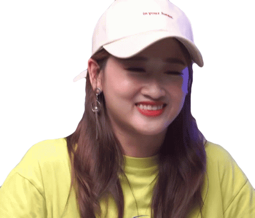 Tiểu Vi laughing heartily with a big smile, wearing a white cap and yellow shirt, expressing joy and amusement.