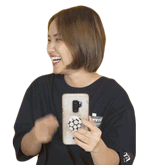 Châu Giang cười thích thú, che miệng bằng tay trong khi cầm điện thoại. Biểu cảm vui vẻ, hài hước.