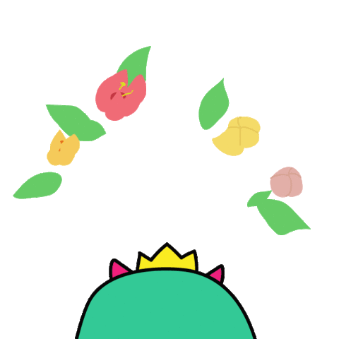 A cute green monster with a crown and flowers on its head expresses admiration and love, with a happy, blushing face.