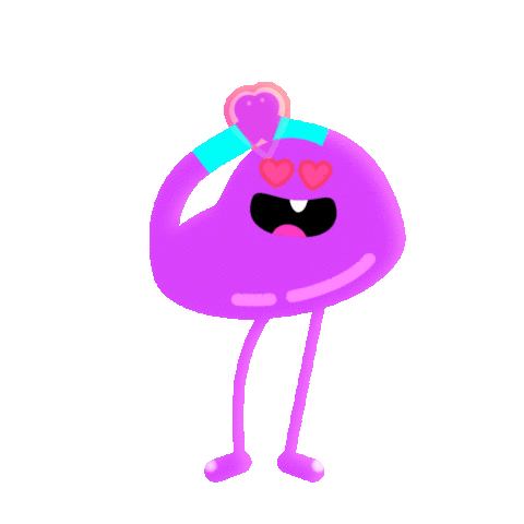 A cute purple cartoon character with heart eyes expresses love and friendship, holding a growing pink heart.