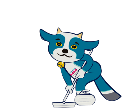 Yodli, the Lausanne 2020 mascot, is animated sweeping the ice while playing curling.