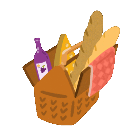 A charming picnic basket filled with a bottle of wine, a wedge of cheese, two baguettes, and a red checkered cloth.