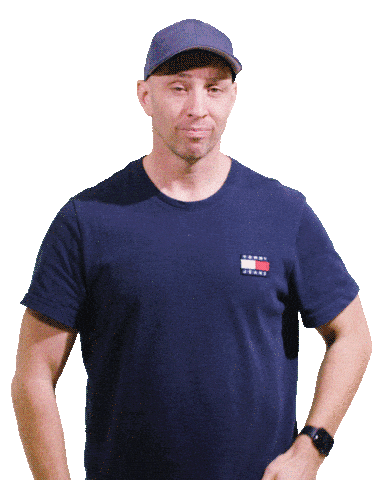 A man in a Tommy Hilfiger shirt and hat makes a 'cut it out' or 'no way' gesture, expressing disagreement or refusal.