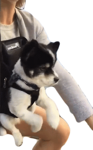 An adorable small black and white dog sits comfortably on a person's lap, looking to the side with its front paws charmingly crossed.