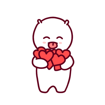 A cute alien character with pink cheeks and tongue out, happily holding a bunch of bright red hearts, conveying affection.