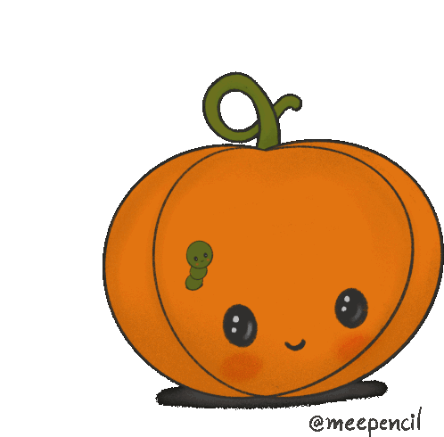 An adorable animated pumpkin with a cheerful smile and a tiny green caterpillar wiggling on its side, perfect for a happy Halloween.