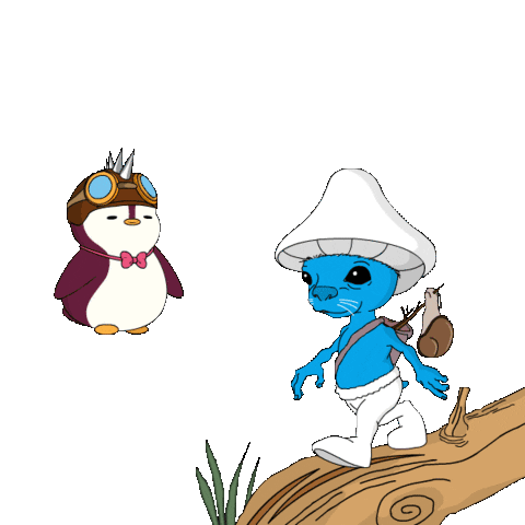 a smurf with a snail on his back is standing next to a penguin with a helmet on