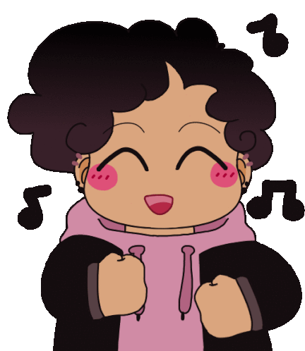 A cute animated character with curly hair and a pink hoodie dances happily, surrounded by musical notes, spreading good vibes.