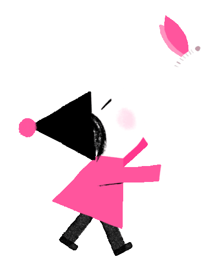 A cute animated girl in pink reaches out playfully towards a fluttering pink butterfly, expressing wonder and joy.