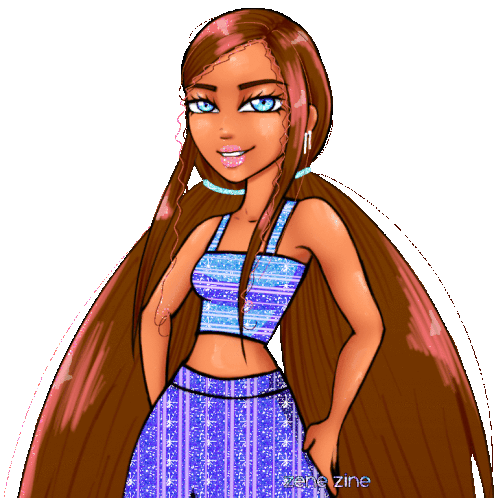 A cute cartoon girl by Zene Zine with long brown hair, blue eyes, and glittery blue and purple outfit, sparkling with animated glitter.