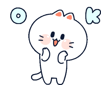 An adorable white cartoon cat expresses affection, then smiles with an 'OK' message, conveying support and love.