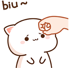 A cute white cartoon cat gets a gentle finger poke on its forehead, accompanied by the text 'biu ~'.