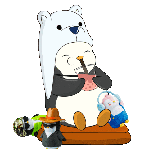 A cute penguin wearing a polar bear hat sips on a refreshing bubble tea, surrounded by its adorable penguin friends.
