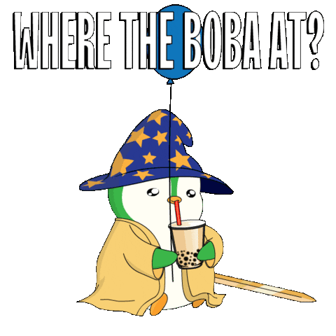 A cute wizard penguin wearing a star-studded hat and robe sips bubble tea, asking 'Where the Boba At?' with a blue balloon.