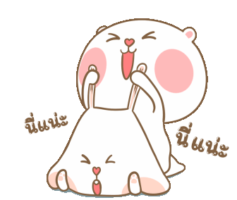 A mischievous cartoon bear playfully pulls the ears of another grumpy bear, with the Thai caption 'Take that!' appearing.