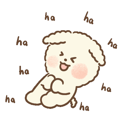 An adorable fluffy beige dog character lying on its back, laughing joyfully with "ha ha ha" text floating around it.